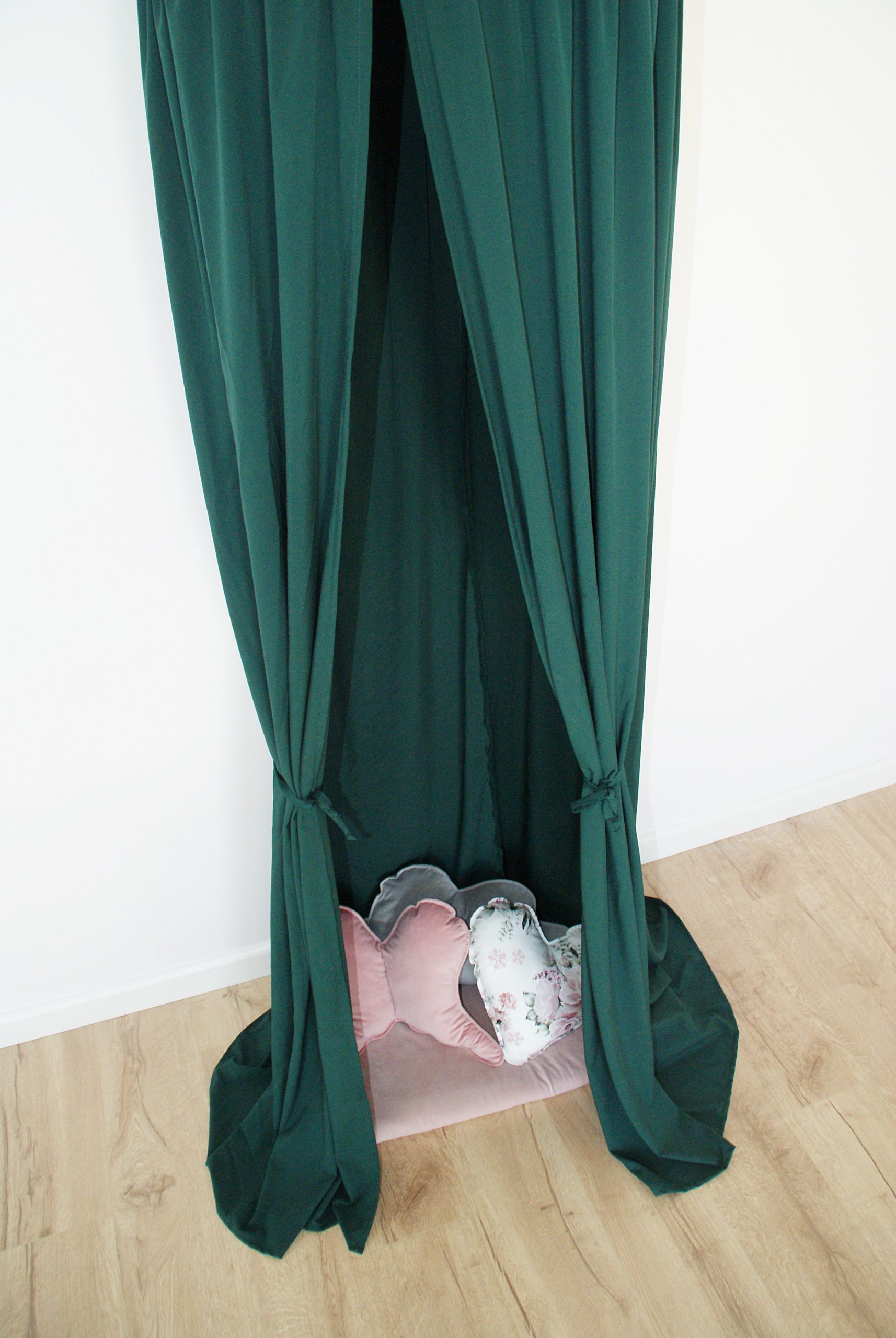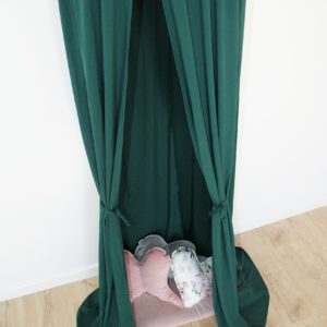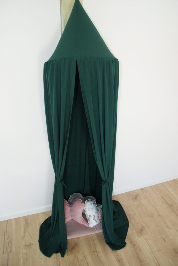 Materiał ten jest w kolorze pięknej, głębokiej zieleni. To kolor tej jesieni! Powieszony nad łóżeczkiem wyciszy i uspokoi dziecko przed snem. Baldachim można zamocować nad łóżeczkiem lub w dowolnym miejscu w pokoju.