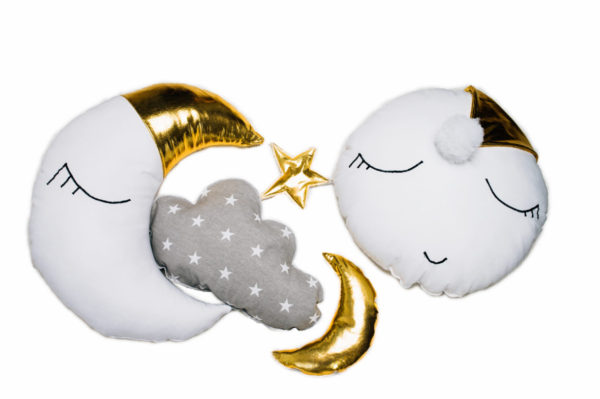 W skład zestawu wchodzą dwie poduszki, oraz trzy zawieszki w kształcie chmurki, księżyca i gwiazdki. Poduszki mogą być również uzupełnieniem księżycowego tipi, które mamy w ofercie.