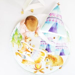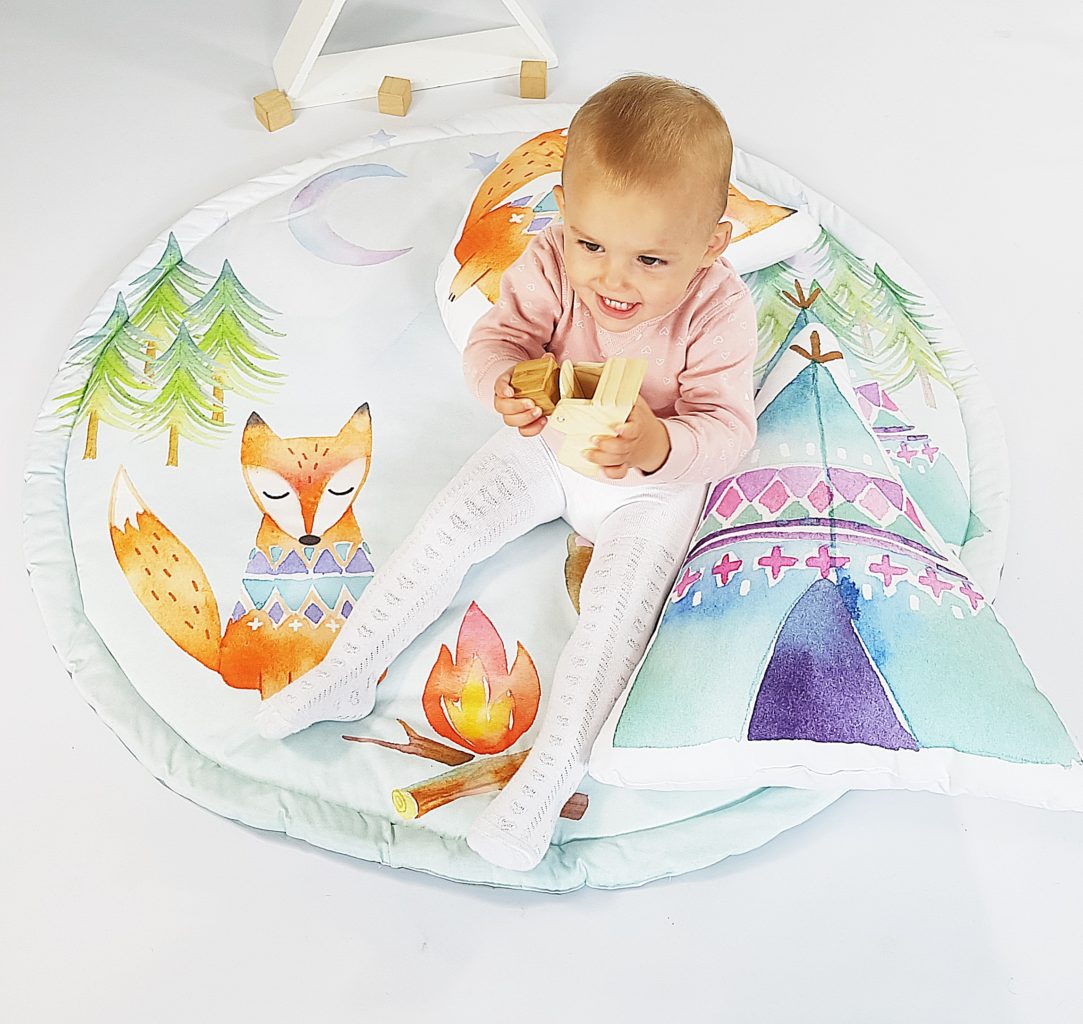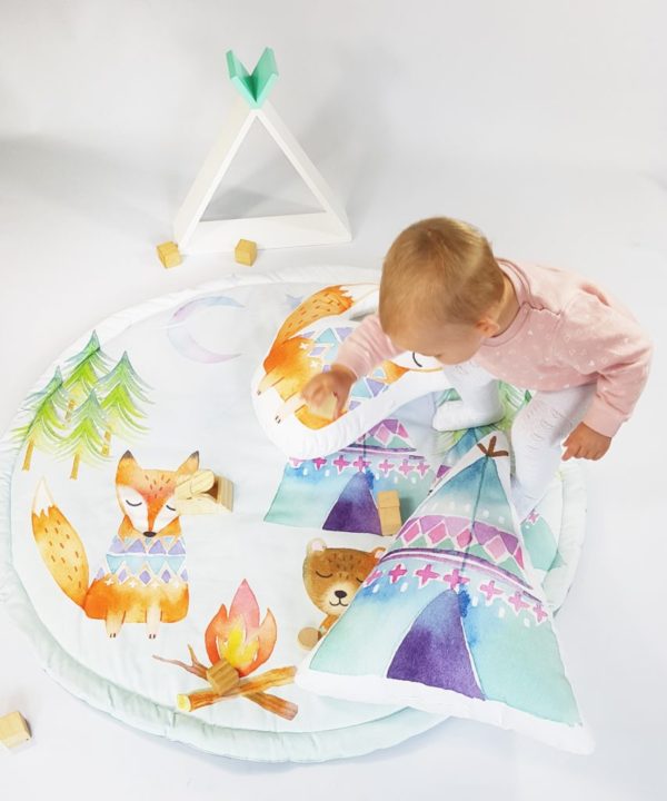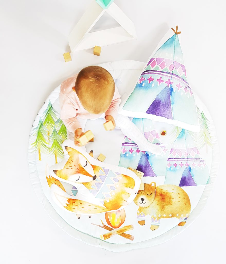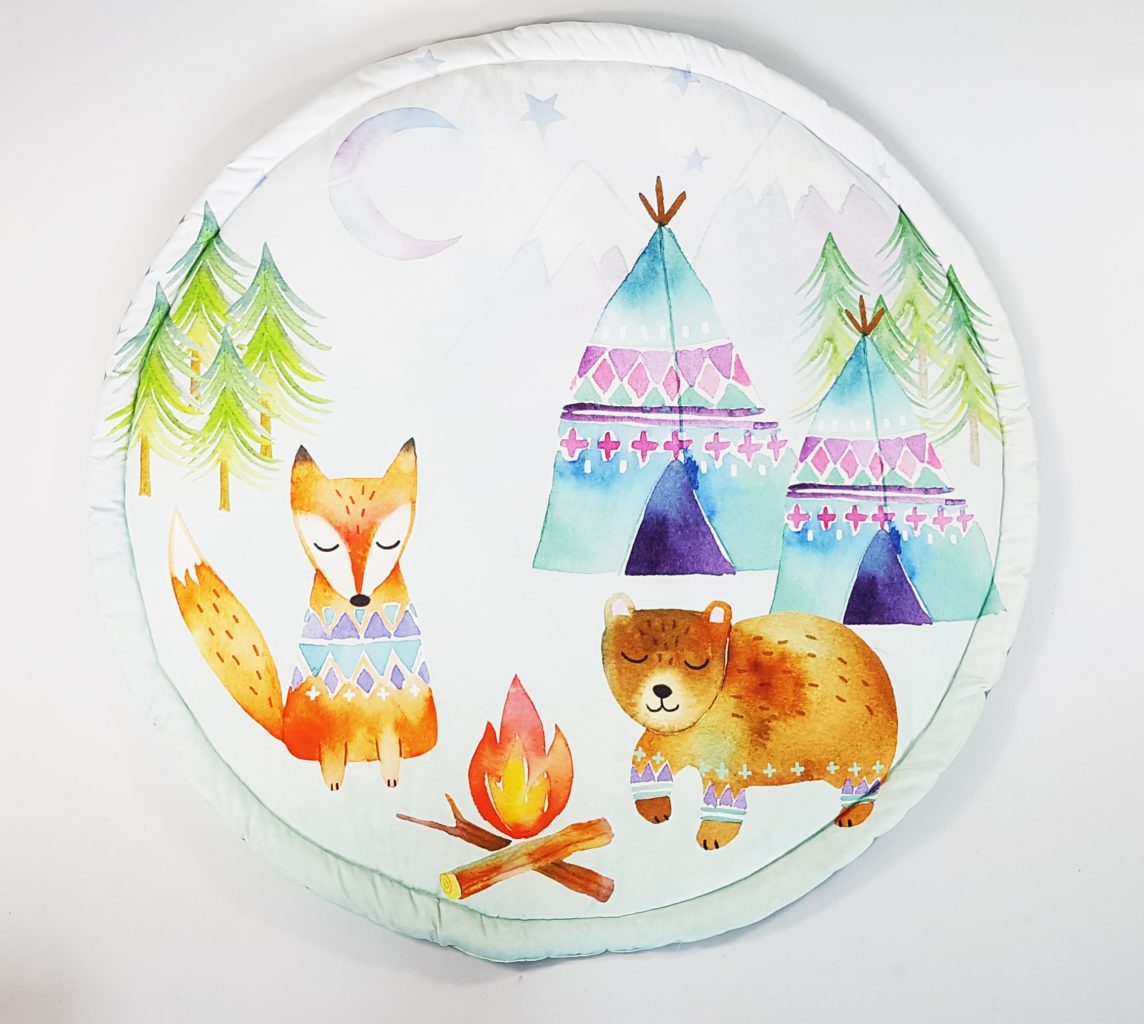 Mata z jednej strony wykonana jest z grubego materiału bawełnianego. Wzór zwierzątek został nadrukowany specjalistycznymi farbami, które są bezpieczne dla dzieci, nawet tych najmniejszych. Od spodu mata jest obszyta materiałem wodoodpornym, dzięki czemu można ją zabrać na piknik, na plażę, do ogrodu czy na taras.