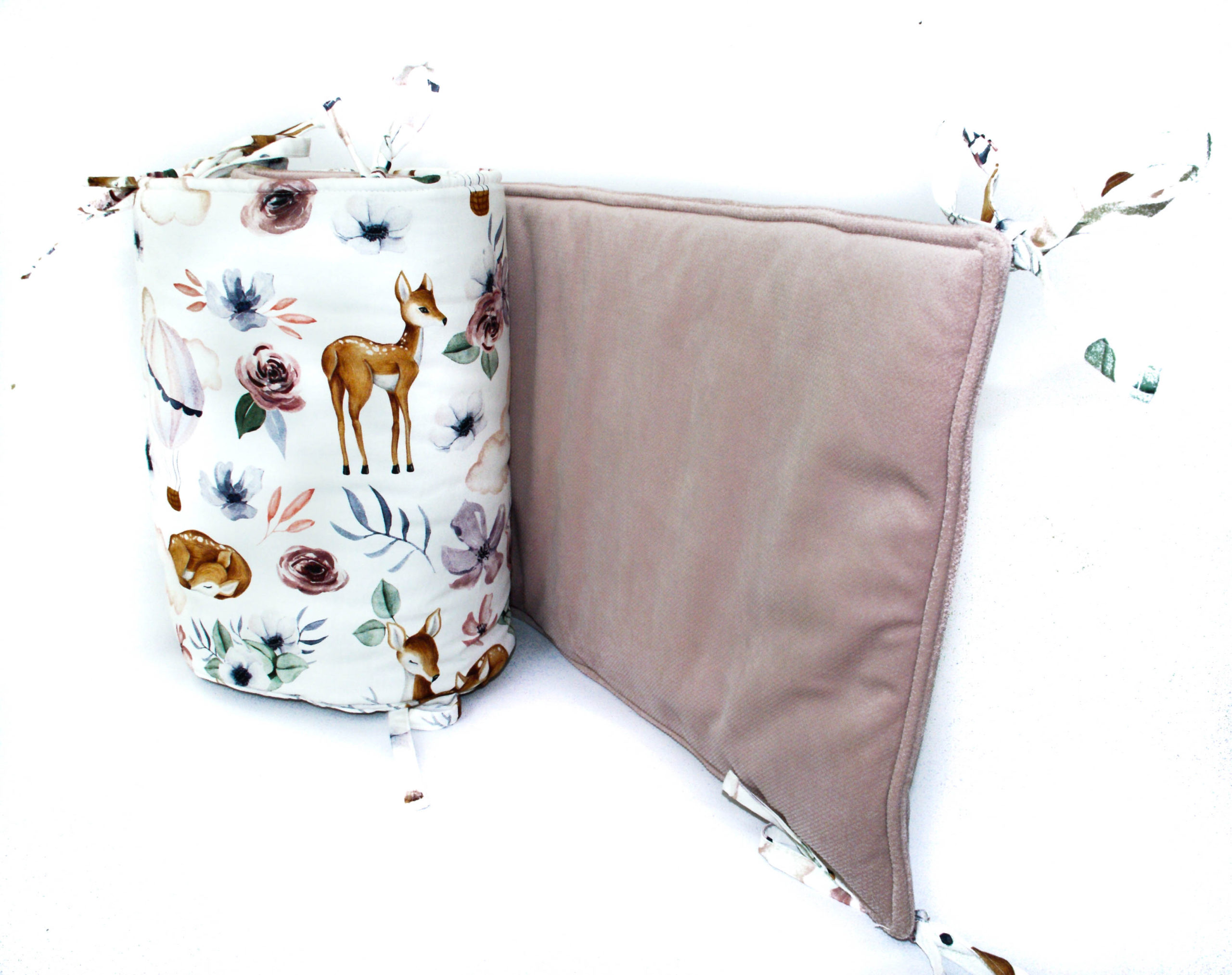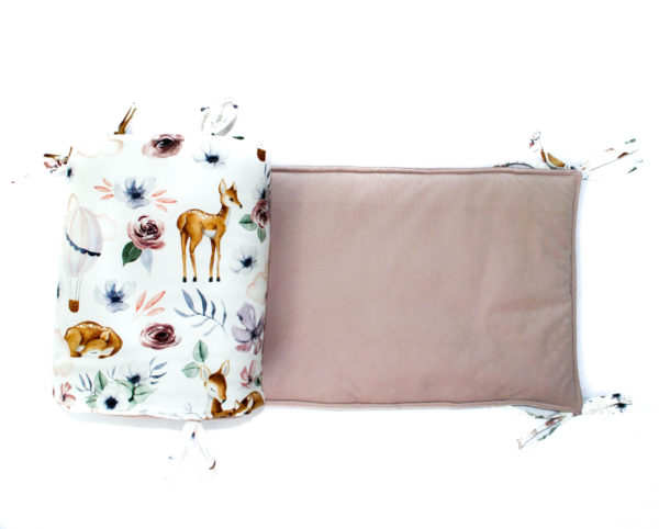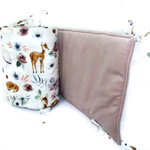 Nasz ochraniacz jest wykonany z tkaniny velvet, niezwykle miłej, miękkiej i przyjemniej  w dotyku oraz tkaniny bawełnianej we wzór.