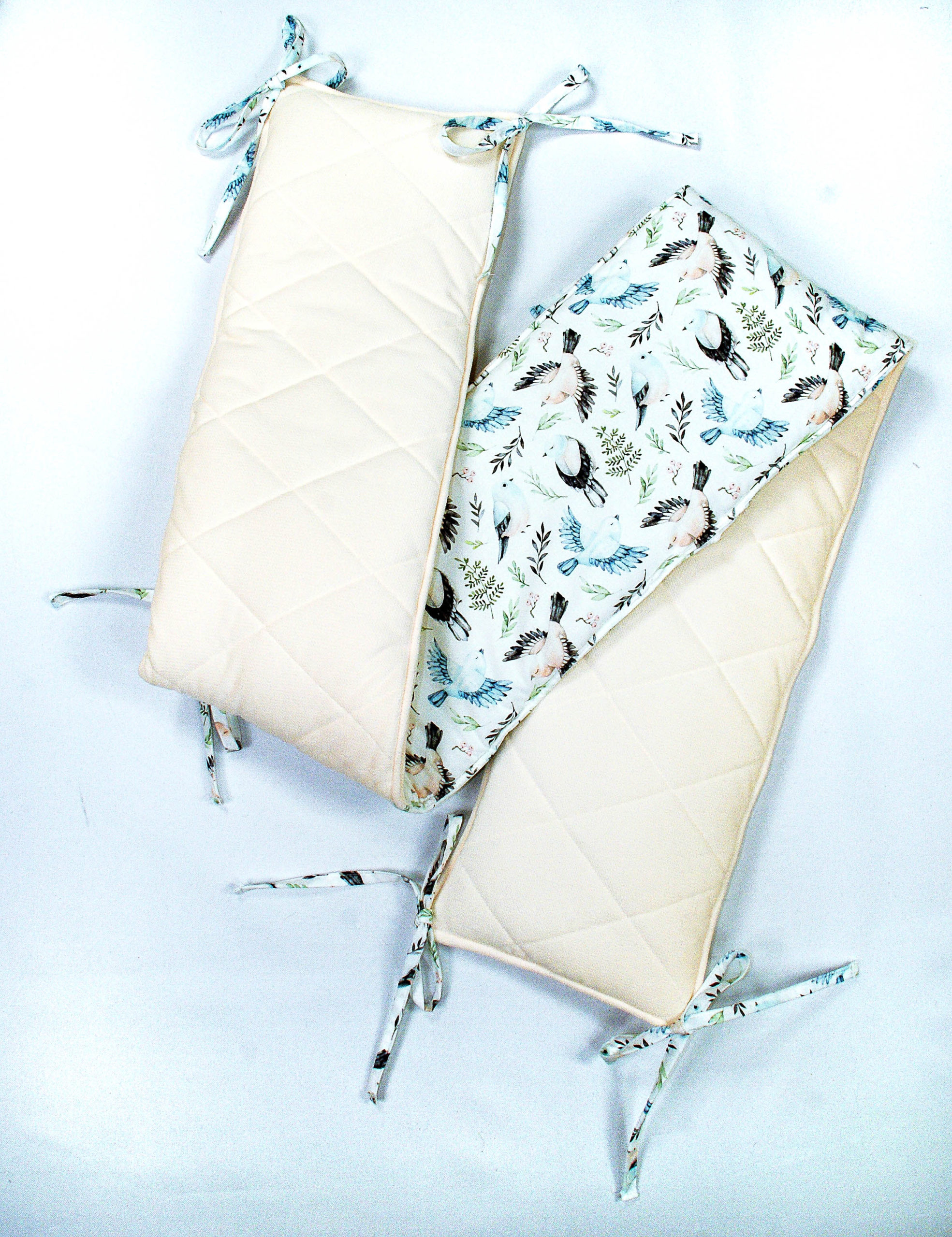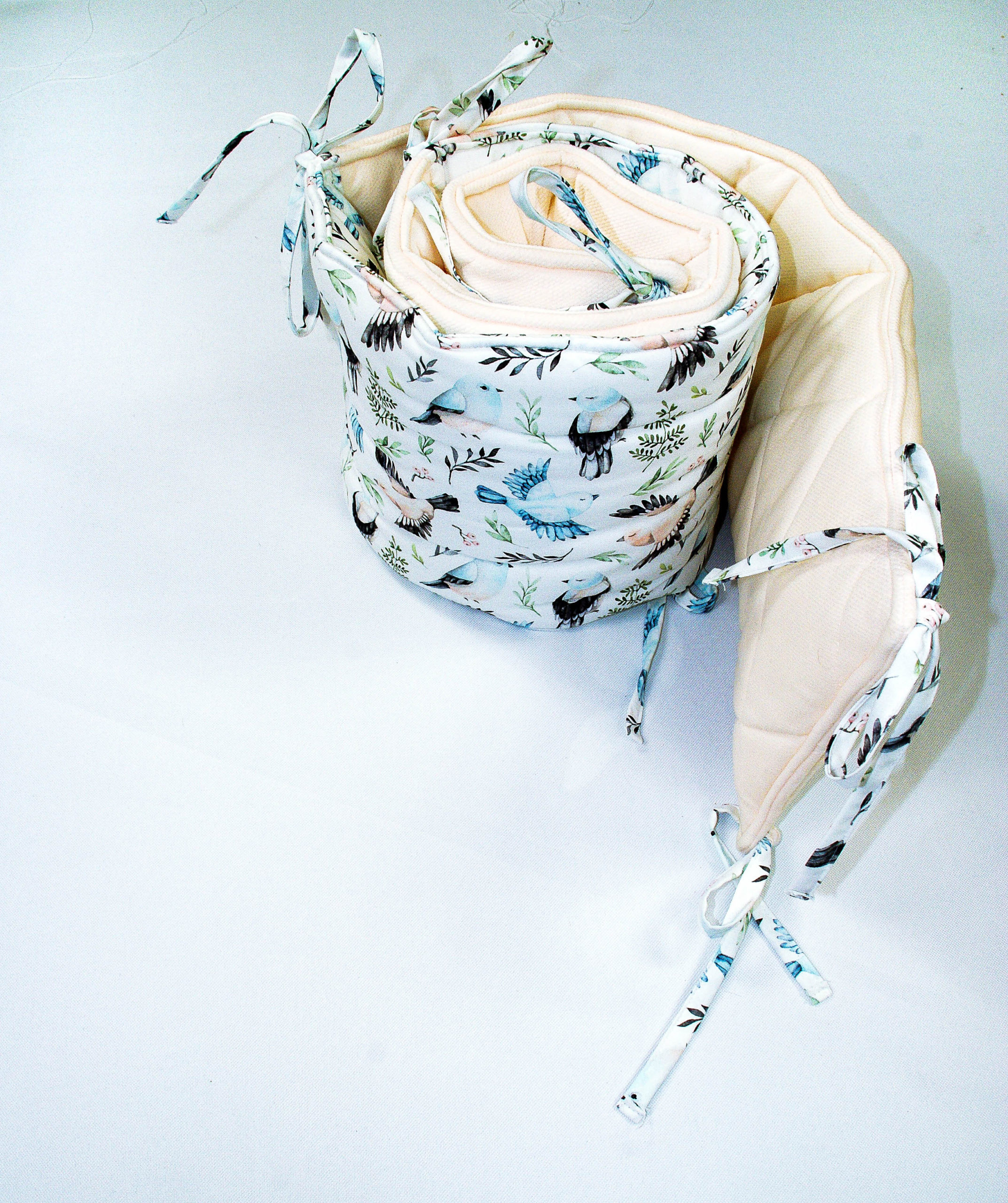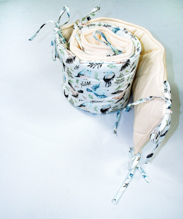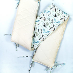 Nasz ochraniacz jest wykonany z tkaniny velvet, niezwykle miłej, miękkiej i przyjemniej  w dotyku oraz tkaniny bawełnianej we wzór. Ochraniacz do łóżeczka ma rozmiar 30x180cm (+/-3cm). Jest mocowany za pomocą, bawełnianych troków – ich odpowiednie rozmieszczenie sprawia, że ochraniacz pasuje idealnie do łóżeczka dziecięcego.