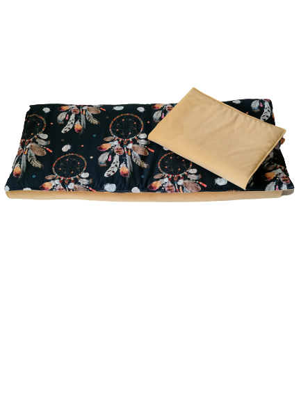 Komplet składa się z poszewki na poduszkę oraz kołderkę, pościel zamykana jest na zamek. Poduszka i poszewka z jednej strony jest w łapacze na granacie a z drugiej z miękkiego i delikatnego velvetu w kolorze musztardowym.