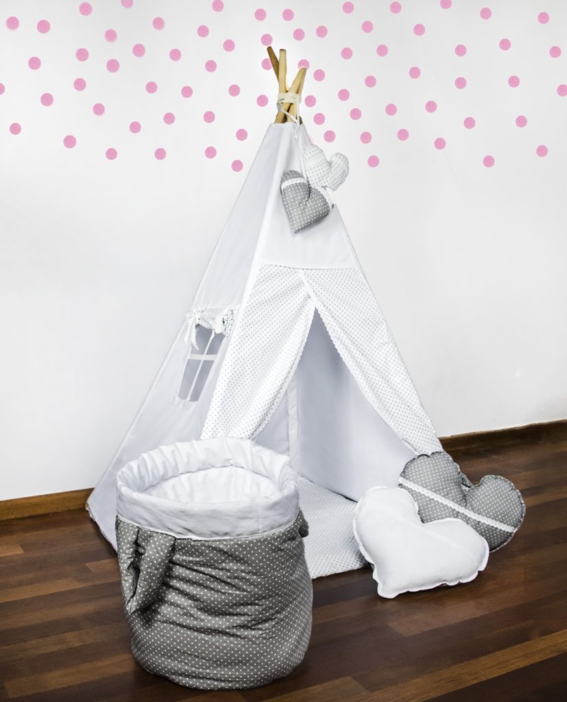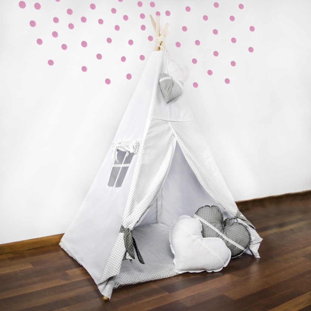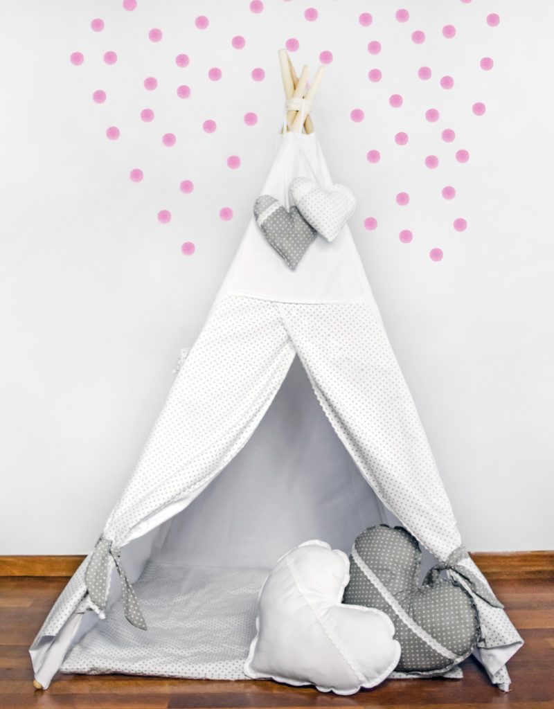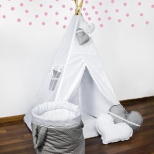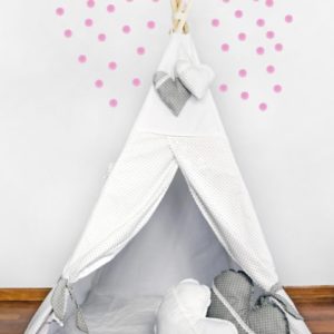 Romantyczny namiot ozdobiony białą koronką to zdecydowanie produkt dla małej Marzycielki. Dwie duże poduszki w kształcie serca udekorują nie tylko namiot ale również pokoik czy łóżeczko dziecka.