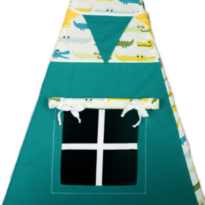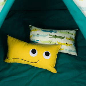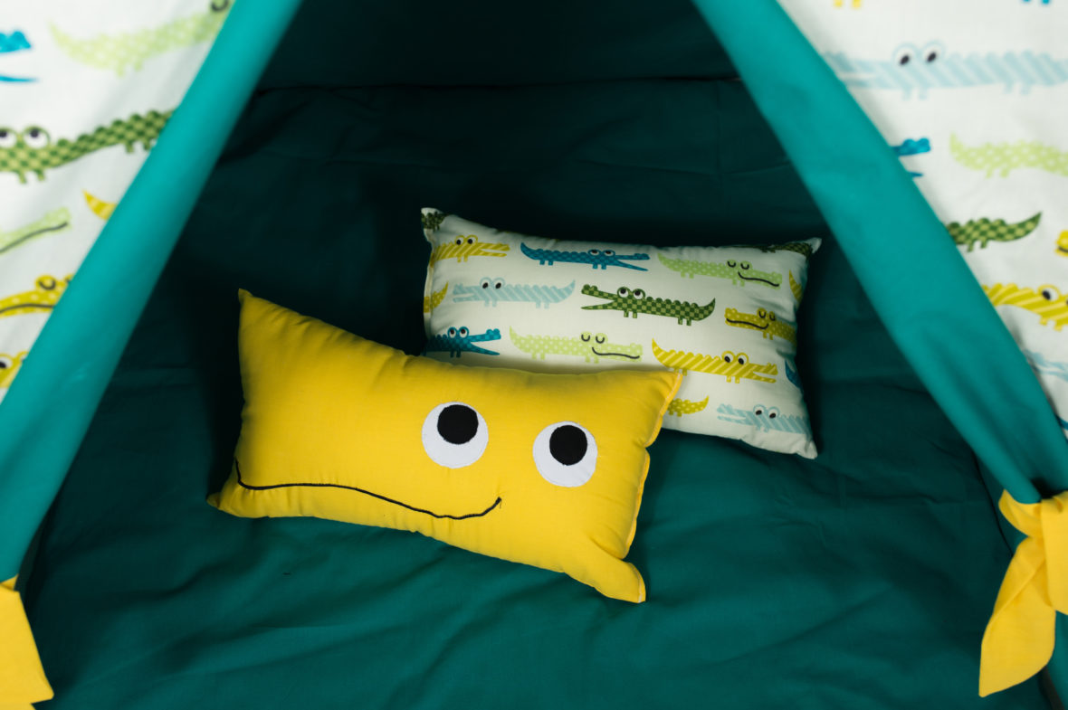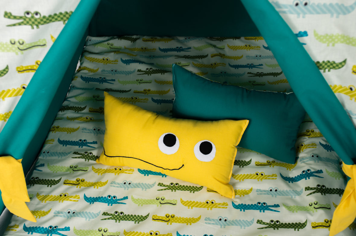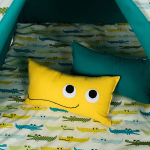 Mamy do wyboru kilkanaście materiałów i wzorów. Namiot może być uszyty z okienkiem lub bez, z pełną listą dodatków lub tylko z wybranymi. Chcielibyśmy zaprezentować namiot w kolorowe gwiazdki. Idealnie sprawdzi się zarówno w pokoju chłopca jak i dziewczynki. Dwustronna podłoga zapewni dużo zabawy, w zależności od dnia i nastroju można zmieniać jej kolor 🙂 Dwie fantazyjne poduchy mogą udekorować nie tylko namiot ale również łóżko dziecka.