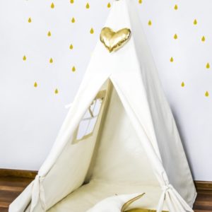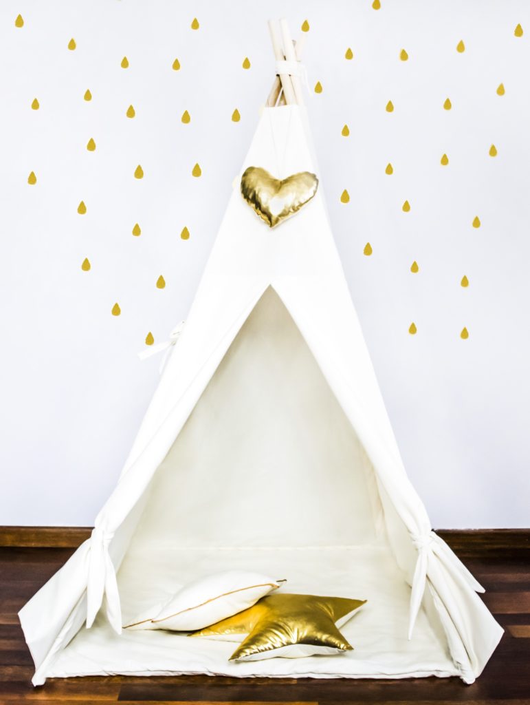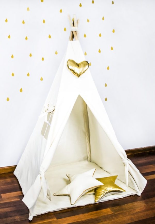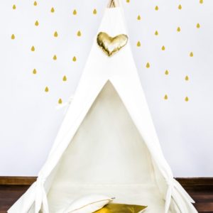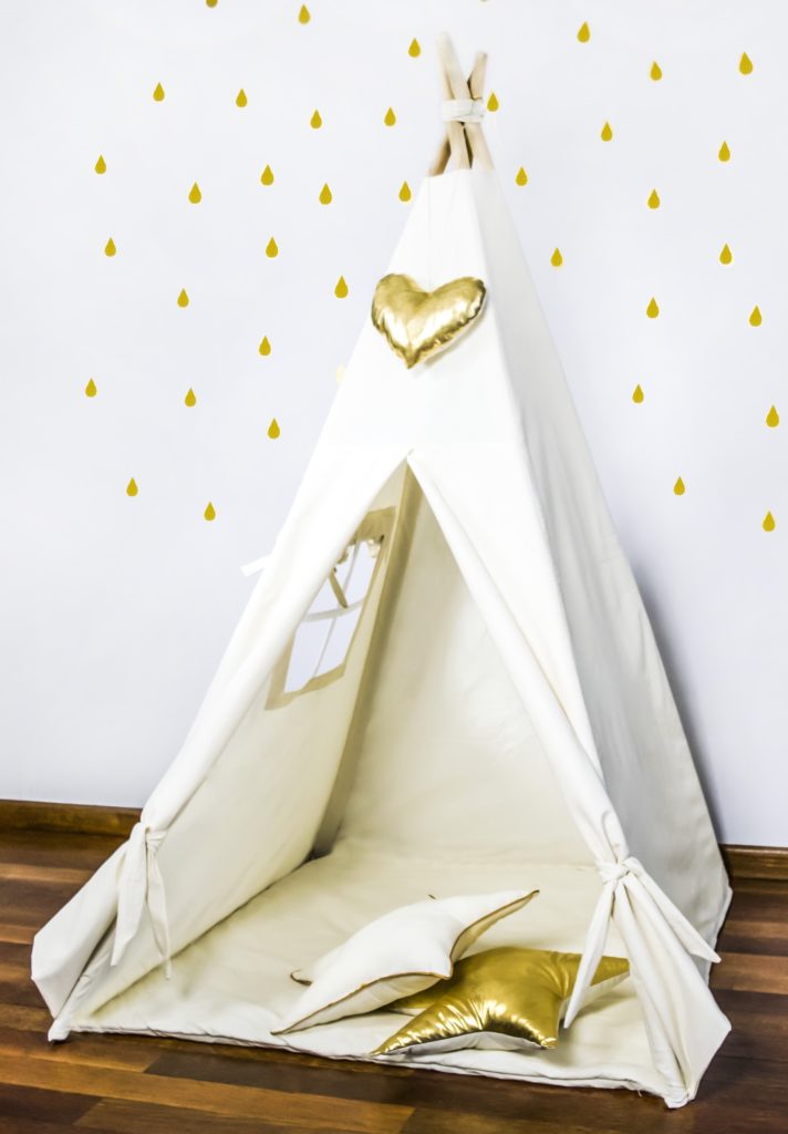 Piękne i subtelne tipi idealne do pokoju dziewczynki. Dwie poduszki w kształcie gwiazdki ozdobione złotym materiałem. Kolor na monitorze może się różnić od tego z którego szyjemy z powodu ustawień monitora.
